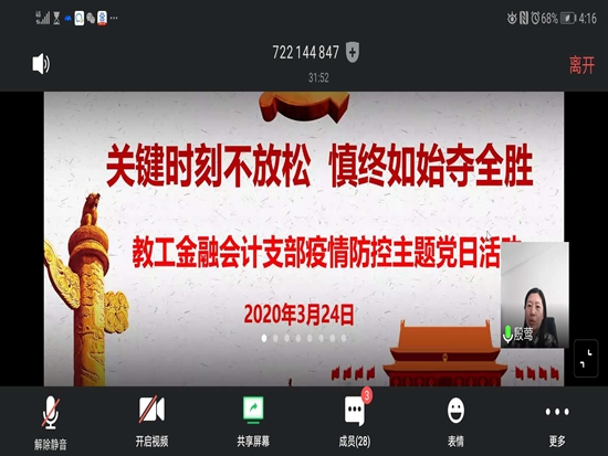 2020年3月24日下午,金融与会计学院党总支教工金融会计支部通过网络视频会议开展了“关键时刻不放松、慎终如始夺全胜”疫情防控主题党日活动,全体教工党员参加。活动由支部书记刘振威主持。