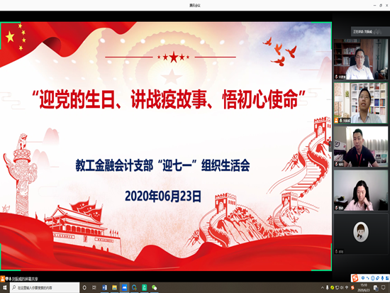 6月23日下午,教工金融会计支部以网络视频会议形式召开“迎党的生日、讲战疫故事、悟初心使命”迎七一组织生活会,全体教工党员参加。会议由支部书记刘振威主持。