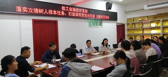 9月29日下午,教工金融会计支部在SY5412会议室开展“落实立德树人根本任务 打造课程思政示范课”主题党日活动,全体教工党员参加。活动由支部书记刘振威主持。