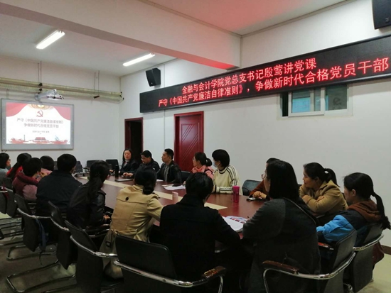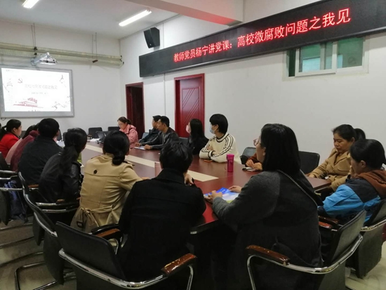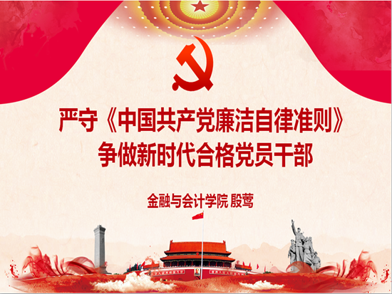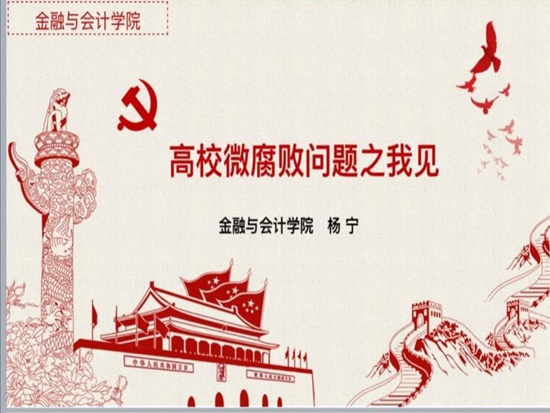 教工金融会计支部党员教师杨宁从自身工作和教学岗位视角进行了《高校微腐败问题之我见》微党课分享,强调加强高校党风廉政建设是党建工作的重要内容,告诫大家必须做到在行动上远离腐败,管得住手脚,抗得住诱惑,守得住底线,才能称得上是一名光荣的党员。