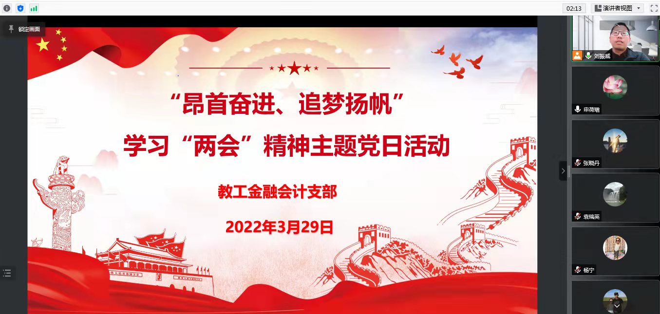 3月29日下午,教工金融会计党支部通过网络视频会议开展了“昂首奋进、追梦扬帆” 学习“两会”精神主题党日活动,全体教工党员参加。活动由支部书记刘振威主持。