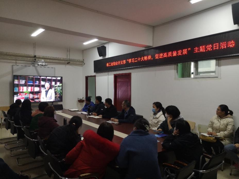 2023年3月28日下午,教工金融会计支部在5412会议室召开“学习二十大精神,促进高质量发展”主题党日活动,全体教工党员参加。活动由教工支部书记刘振威主持。