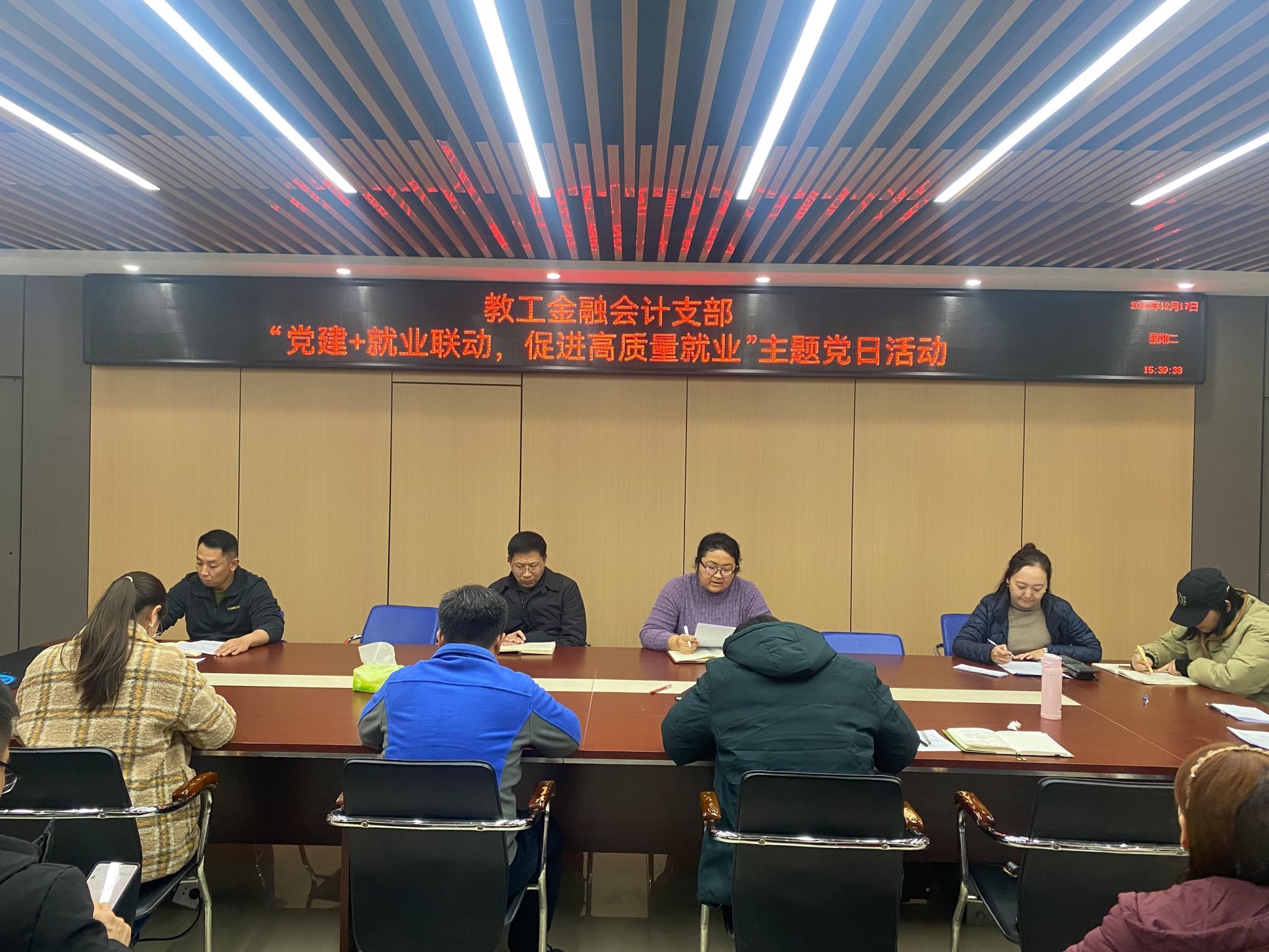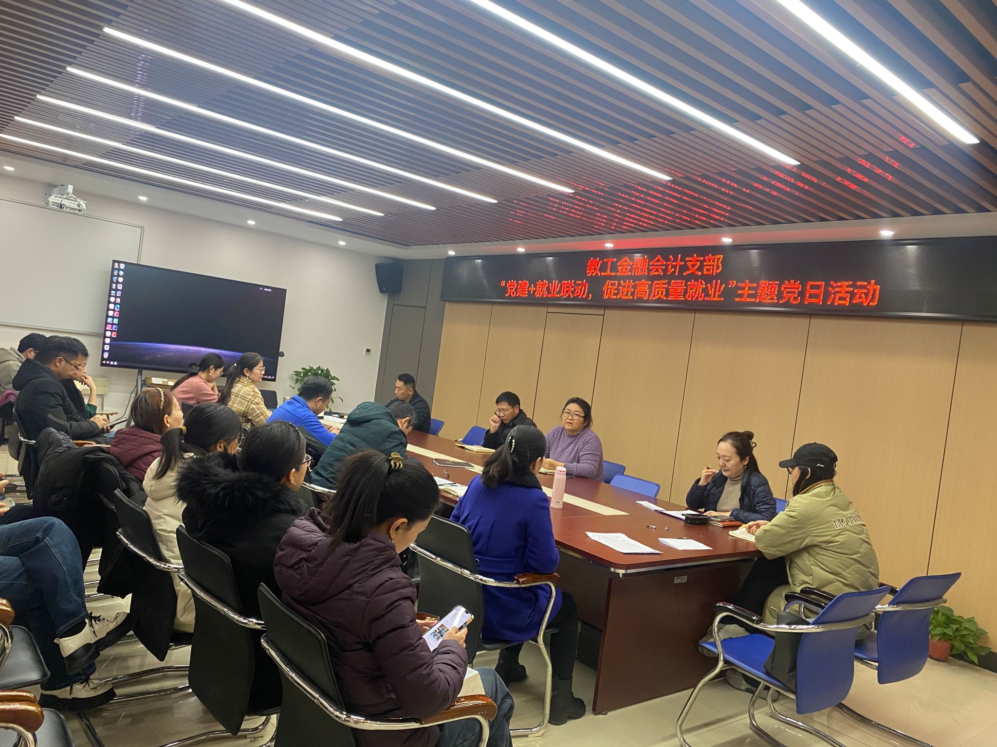 12月17日下午,教工金融会计支部在SY5412会议室开展“‘党建+就业'联动 促进高质量就业”主题党日活动。支部全体党员参加了本次活动。活动由支部组织委员杨阳主持。