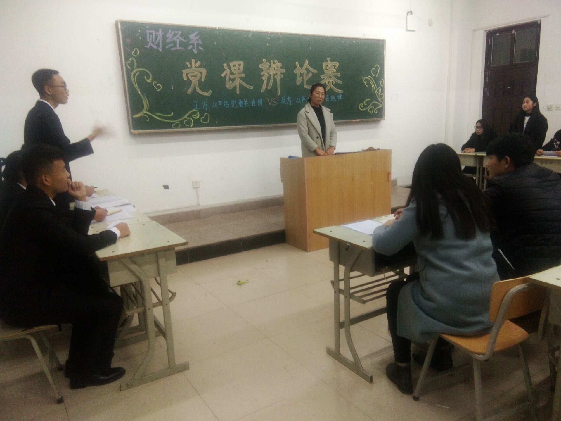 为丰富本次党课的学习形式,11月17日晚上7点半,财经系在JX3506举行了党课友谊辩论会,以“全面从严治党重在自律还是他律”为辩题进行辩论。党课辅导员李灿老师也出席此次辩论赛并担任评委嘉宾。