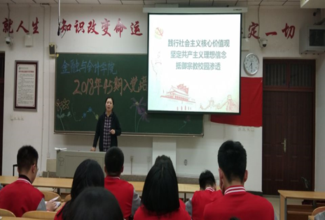 4月26日晚,我院党总支书记殷莺在JX6103教室为第45期入党积极分子和2019年上半年发展对象上党课。