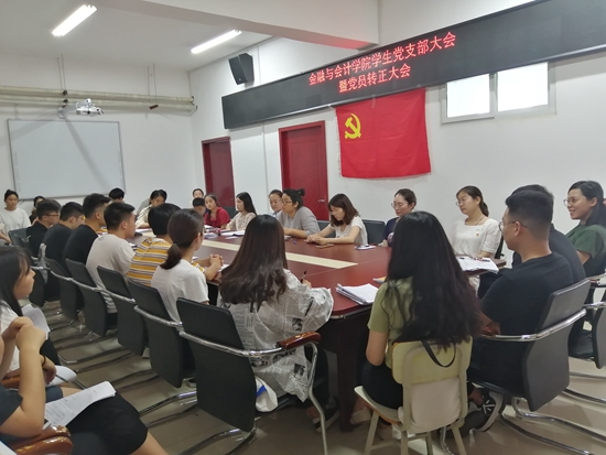 2019年6月6日中午12点40分,金融与会计学院学生党支部于SY5412会议室召开了预备党员转正大会。院党总支副书记胡晓慧,党总支办公室主任马峥,学生党支部组织委员和琰、宣传委员闫艳,2016级辅导员张满,2018级辅导员杨士卿及14名预备党员和5名正式学生党员参加了此次会议。