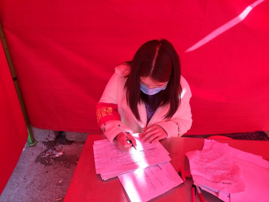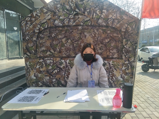 注会1704班李书真在村口疫情防控执勤点进行人员、车辆登记工作
