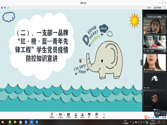 活动首先由院学生会文体部张雅慧同学为参会的小朋友们介绍“六一儿童节”的由来,张雅慧同学声情并茂的讲解赢得小朋友的阵阵掌声;随后学生金融会计支部的党员董心悦同学为小朋友们讲解疫情防控知识,现场演示正确佩戴口罩的方法,视频学习“七步洗手法”,并和小朋友在线开展疫情防控知识抢答活动,新颖的活动形式极大地调动了小朋友的积极性,现场气氛十分热烈;“小水滴”志愿者王佳妮开展儿童价值观教育活动,结合实际案例重点讲解了网络平台误充值的危害性,帮助小朋友树立正确的金钱观和价值观;最后,活动在“小水滴”志愿者申帅为大家献唱歌曲《童年》的歌声中落下帷幕。