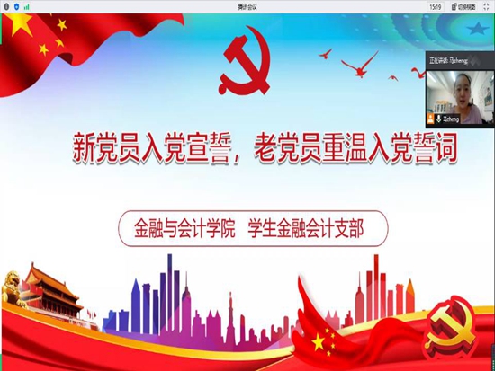 为庆祝中国共产党建党99周年,2020年7月1日上午,金融与会计学院学生金融会计支部举行“新党员入党宣誓 老党员重温入党誓词”活动,此次活动通过腾讯会议线上开展,全体支部师生党员参加。活动由支部书记马峥主持。