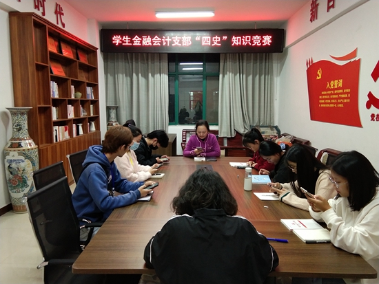 为深入贯彻习近平新时代中国特色社会主义思想,引导广大学生党员知史爱党、知史爱国,10月20日下午,学生金融会计支部在SY5407党员活动室开展支部品牌活动“红·橙·蓝—青年先锋工程”“四史”知识竞赛,支部全体学生党员参加。活动由支部书记马峥主持。