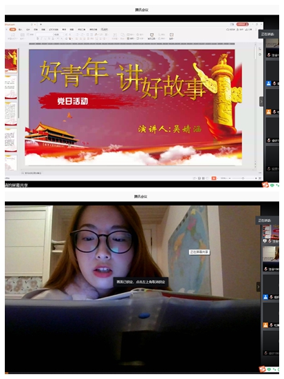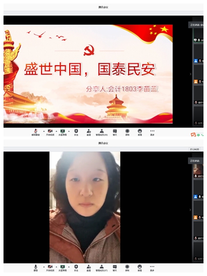 学生党员李苗蓝以“盛世中国,国泰民安”为主题深情向大家讲述为了新中国成立的之初,西方世界对我国实行全面封锁,在孤立无援的情况下,中国共产党领导全国人民自力更生、艰苦创业,克服了一个又一个困难,创造了一个又一个奇迹,初步实现了国家的繁荣富强的故事。