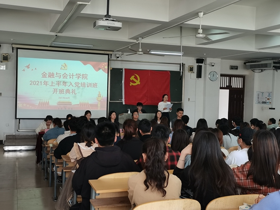 4月30日中午,金融与会计学院在JX6402教室举行2021上半年入党培训班开班典礼,院党总支书记殷莺、院党总支副书记胡晓慧、组织员闫艳、学生支部书记马峥、学生支部组织委员杨士卿、辅导员方芳、魏晓慧、李朝阳及在校学生党员、63名发展对象、126名入党积极分子参加。本次开班典礼由学生支部书记马峥主持。