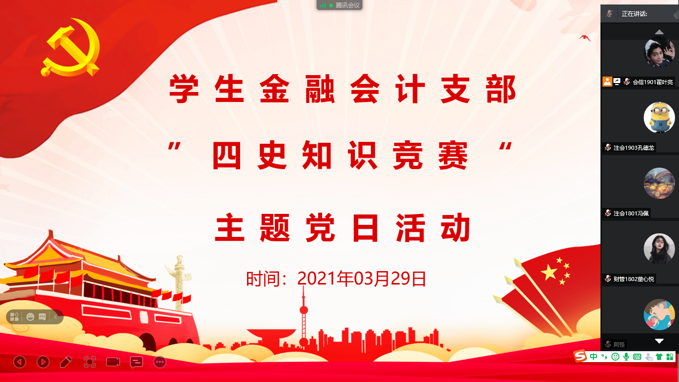 3月29日晚,学生金融会计支部召开“四史知识竞赛”主题党日活动,支部全体党员参加。活动由支部书记马峥主持。