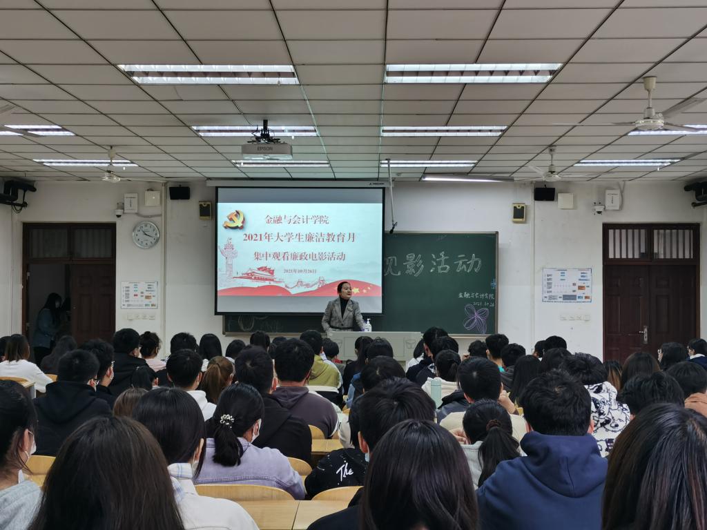 10月26日下午,金融与会计学院在JX6201教室组织开展2021年度大学生廉洁教育讲座暨集中观看廉政电影活动,2021年下半年党员发展对象、入党积极分子和学生代表参加活动,活动由党总支纪检委员马峥主持。