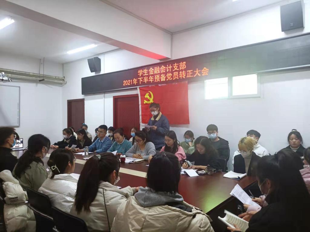 2021年12月7日中午,金融与会计学院学生金融会计支部在SY5412党员会议室召开2021下半年预备党员转正大会,支部全体师生党员参加,会议由支部书记马峥主持。
