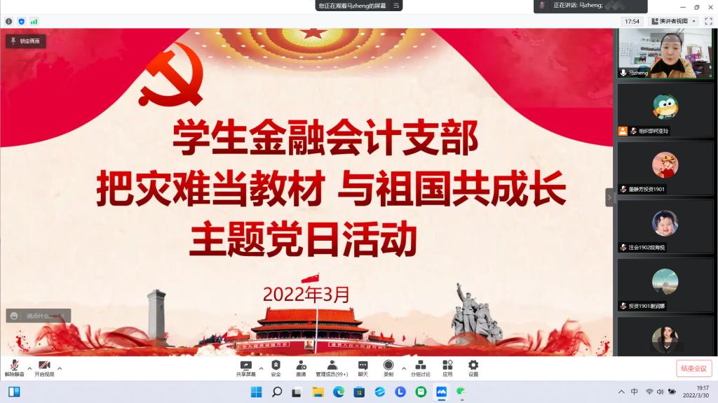 3月30日晚,学生金融会计支部线上召开“把灾难当教材 与祖国共成长”主题党日活动,支部全体党员参加,活动由支部书记马峥主持。