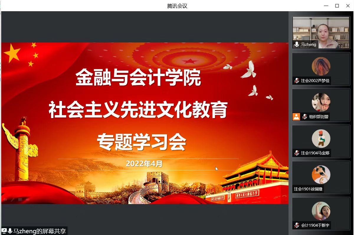 4月29日晚,学生金融会计支部召开社会主义先进文化教育专题学习会,学生支部全体师生党员参会,会议由支部书记马峥主持。