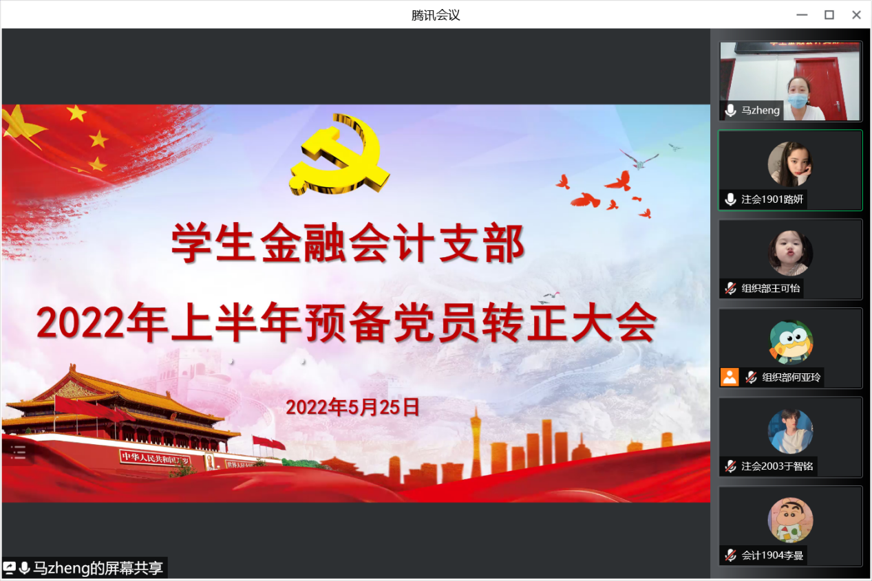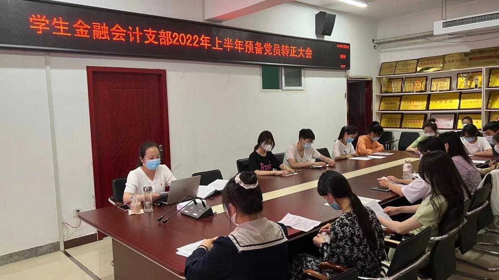 2022年5月25日晚,金融与会计学院学生金融会计支部在SY5412党员会议室召开2022上半年预备党员转正大会,支部全体师生党员参加,会议由支部书记马峥主持。