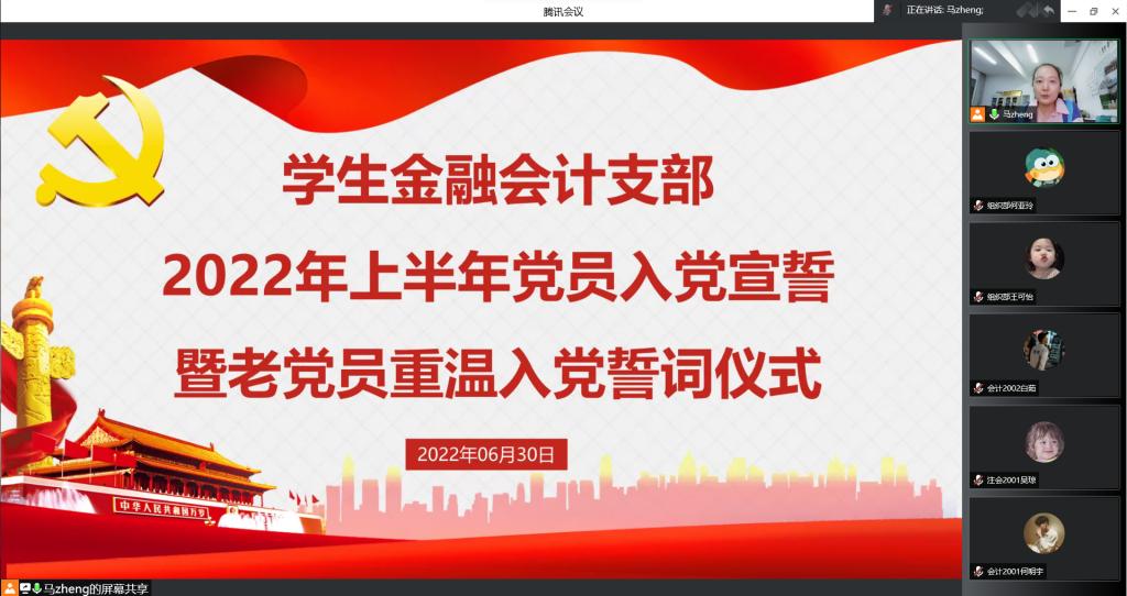 6月30日晚,学生金融会计支部举行庆祝建党101周年入党宣誓仪式暨老党员重温入党誓词活动,支部全体党员参加会议,仪式由支部书记马峥主持。