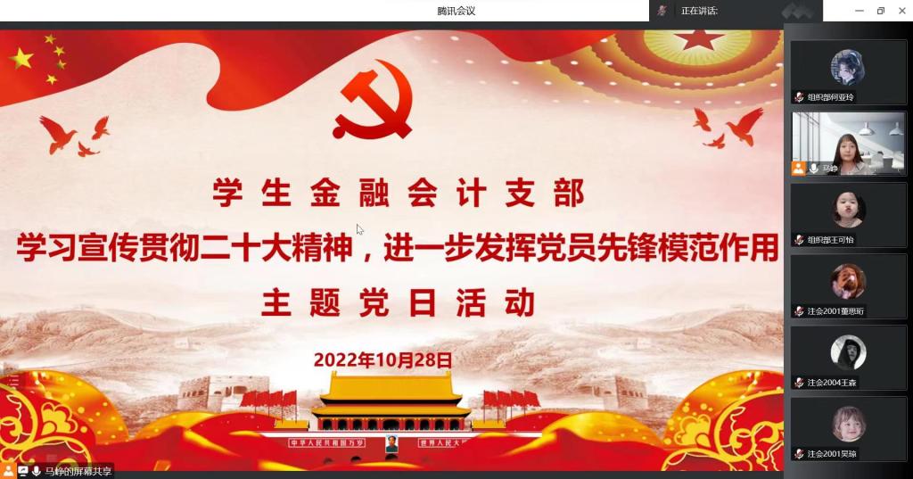 为学习宣传贯彻二十大精神,切实把握党的二十大精神的重大意义,10月28日晚,学生金融会计支部召开“学习宣传贯彻二十大精神,进一步发挥党员先锋模范作用”主题党日活动,支部全体师生党员参加。活动由党支部书记马峥主持。