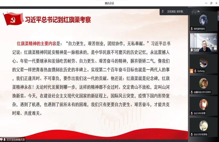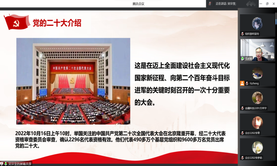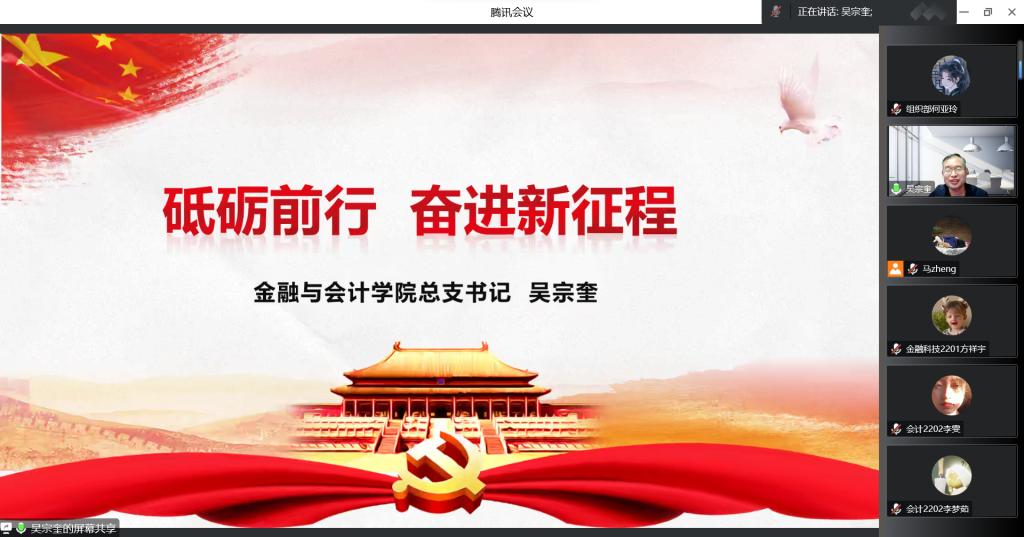 11月24日晚,金融与会计学院党总支书记吴宗奎以《砥砺前行 奋进新征程》为主题,为我院学生党员、2022年下半年入党积极分子、党员发展对象开展线上专题党课。党员发展对象开展线上专题党课。