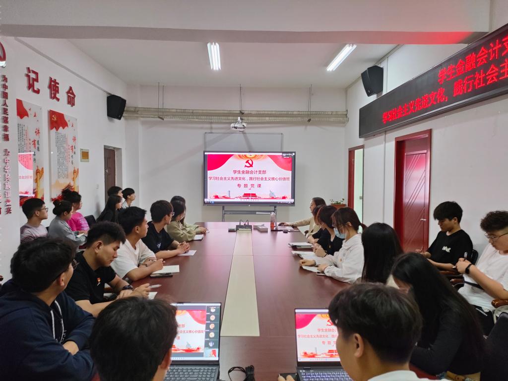 5月30日中午,学生金融会计支部书记马峥在SY5412会议室以《学习社会主义先进文化 践行社会主义核心价值观》为主题,为支部师生党员讲专题党课。