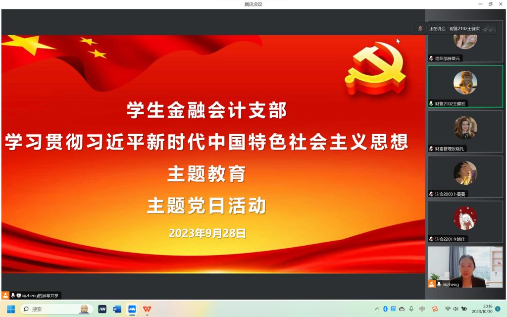 9月28日晚,学生金融会计支部线上召开学习贯彻习近平新时代中国特色社会主义思想主题教育主题党日活动,支部全体师生党员参加,活动由党支部书记马峥主持。