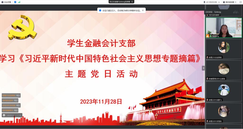 11月28日晚,学生金融会计支部线上召开学习《习近平新时代中国特色社会主义思想专题摘篇》主题党日活动,支部全体师生党员参加,活动由党支部书记马峥主持。