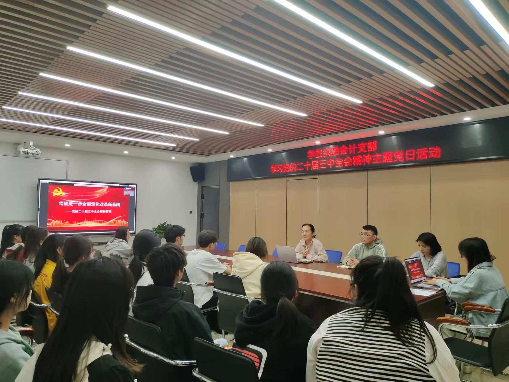 9月30日中午,学生金融会计支部在SY5412会议室召开学习党的二十届三中全会精神主题党日活动,支部全体党员参加,会议由支部书记马峥主持。
