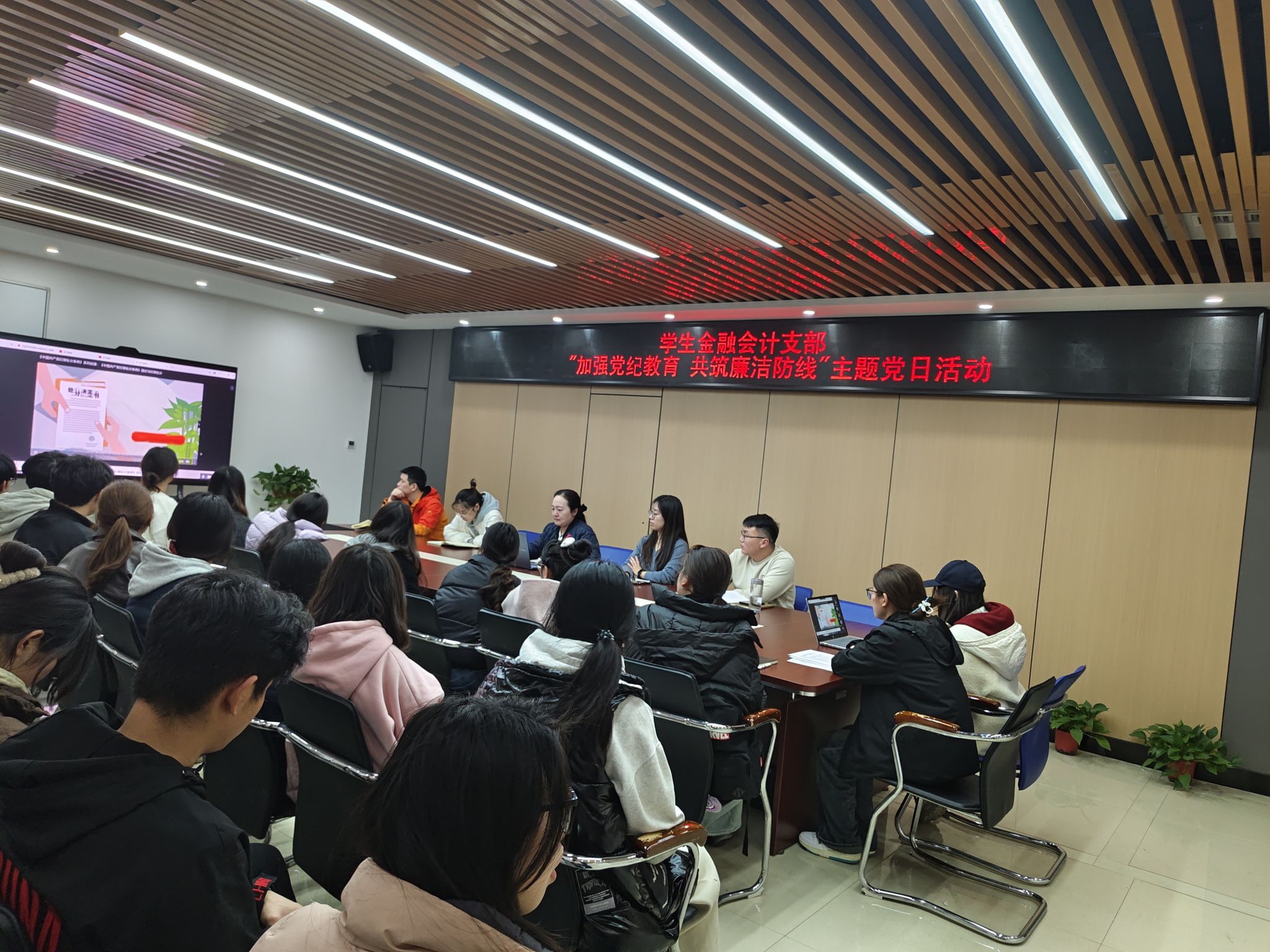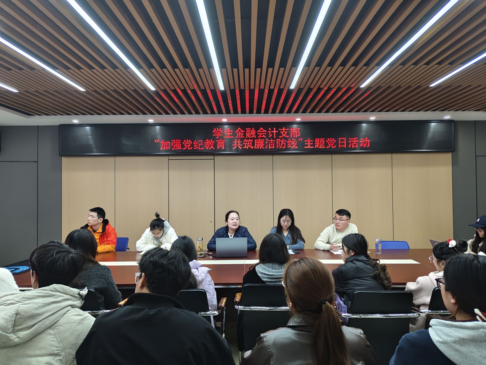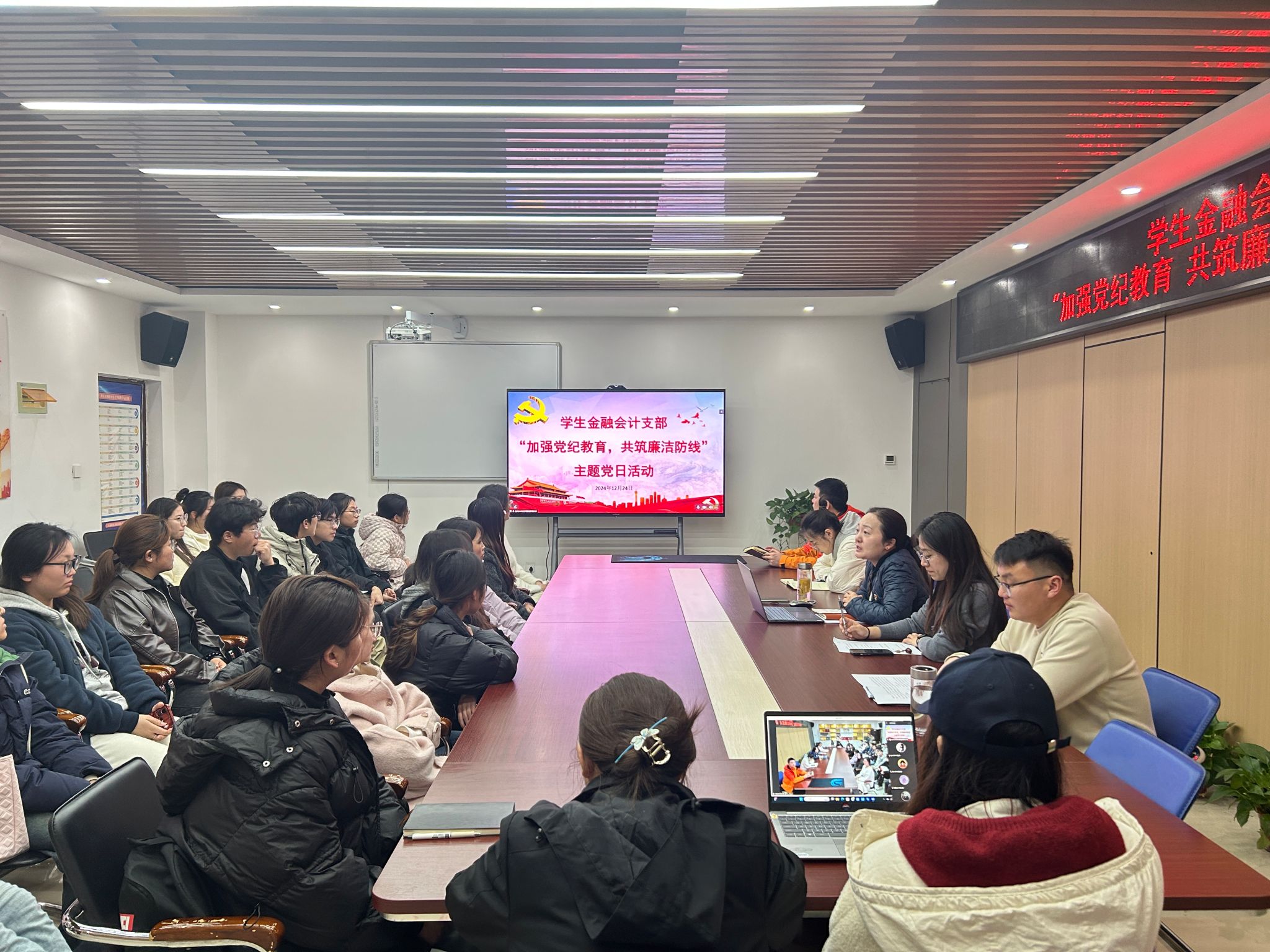 2024年12月24日中午,学生金融会计支部在SY5412会议室召开“加强党纪教育 共筑廉洁防线”主题党日活动,支部师生党员参加,活动由支部书记马峥主持。