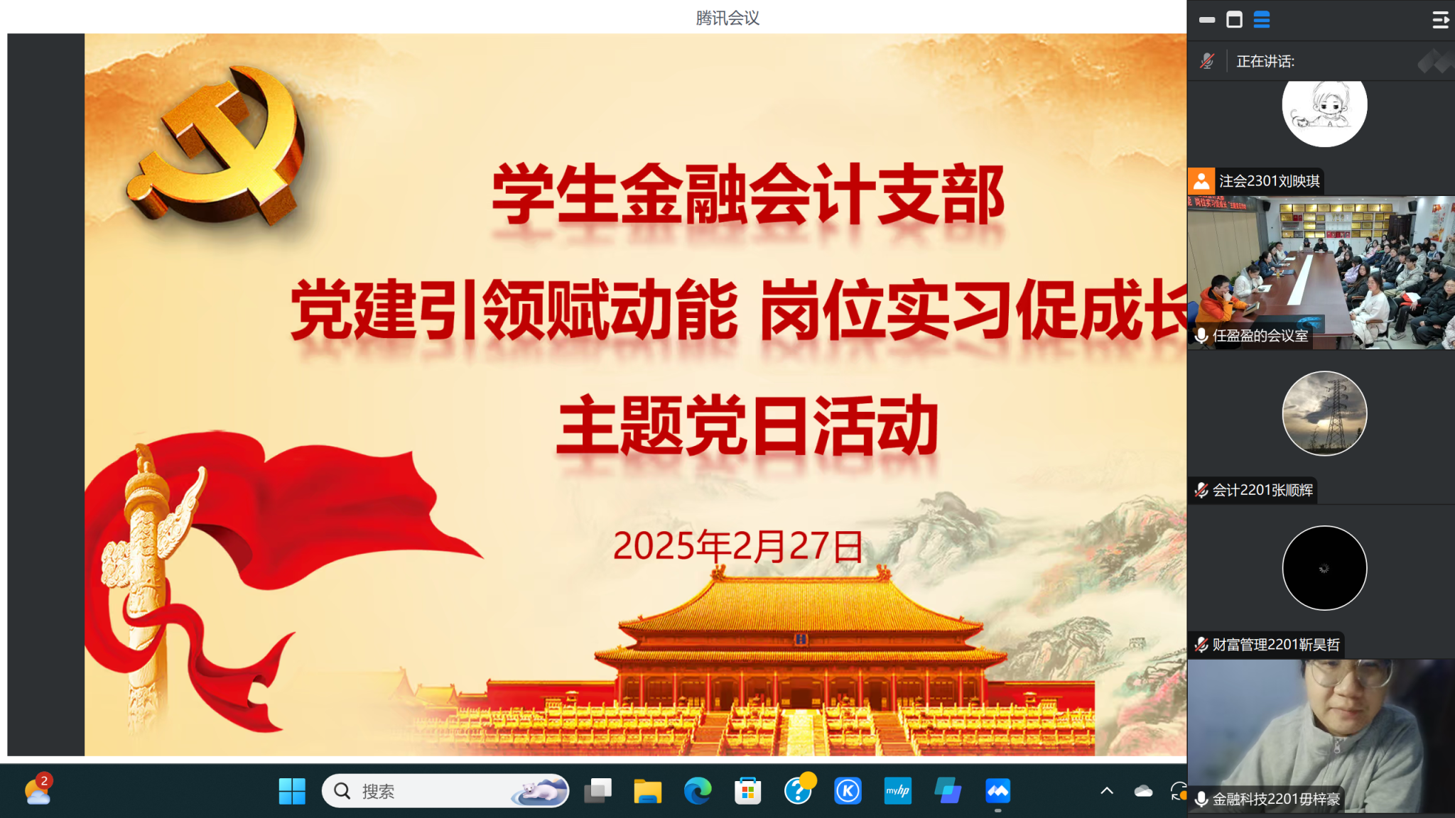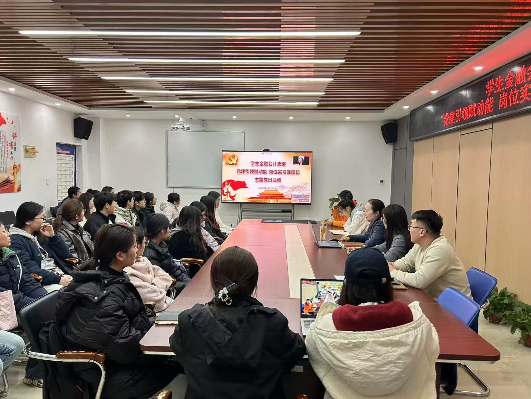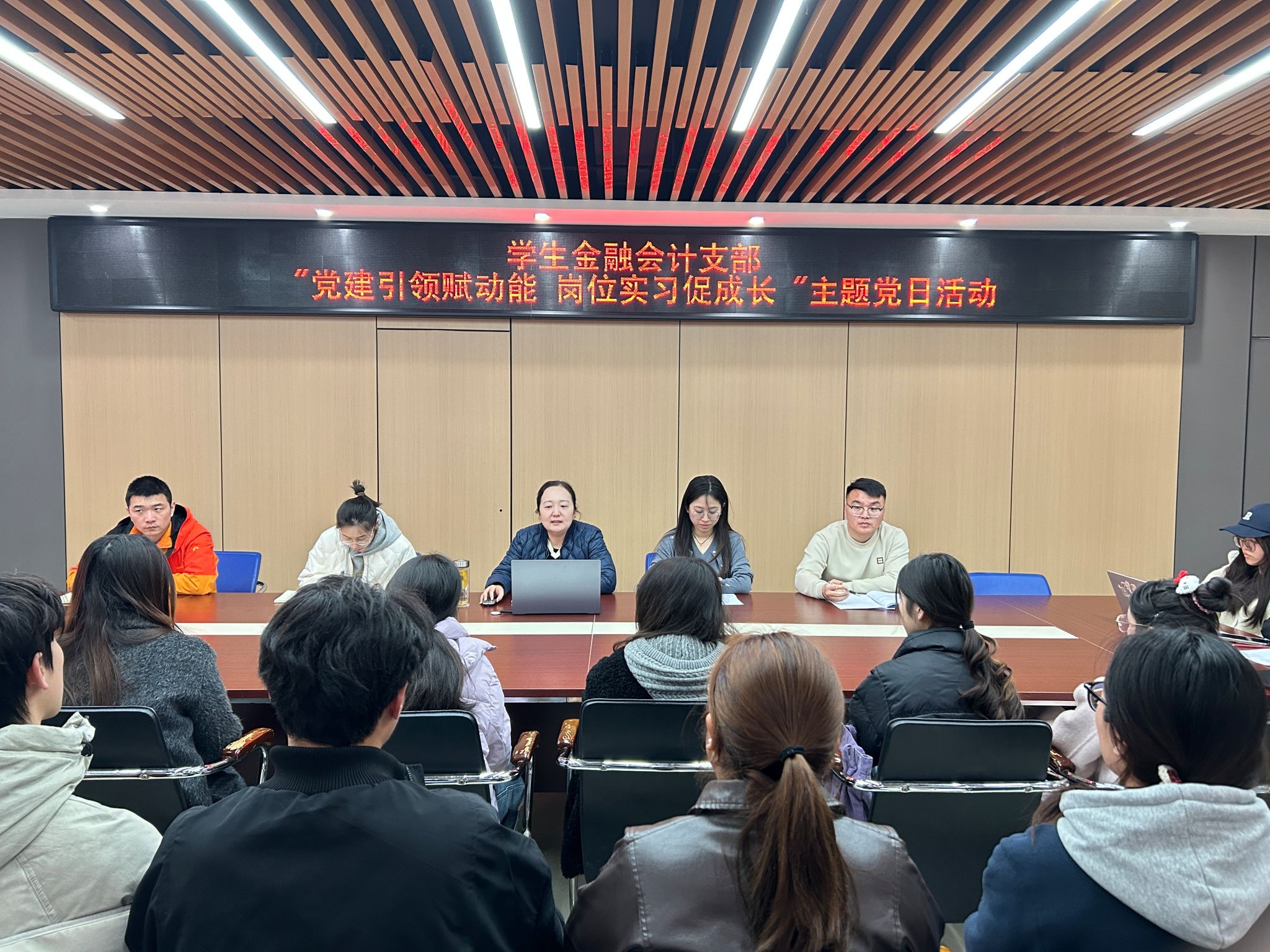 2025年2月27日,学生金融会计支部在SY5412会议室召开“党建引领赋动能 岗位实习促成长”主题党日活动,支部全体师生党员参加,活动由支部书记马峥主持。