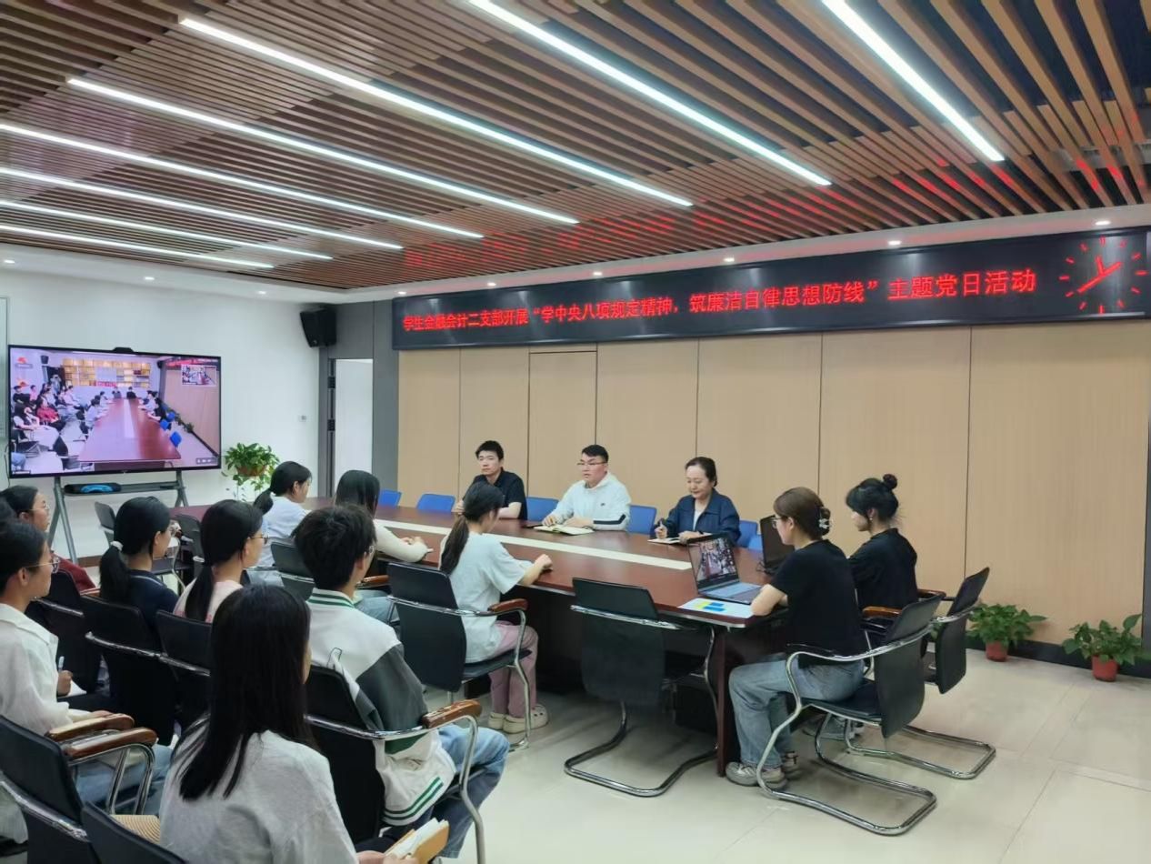 2025年4月29日中午,学生金融会计二支部开展“学中央八项规定精神 筑廉洁自律思想防线”主题党日活动,院党总支办公室主任、专职组织员马峥、学生金融会计二支部书记徐东亚、宣传委员朱命龙及支部全体党员参加。