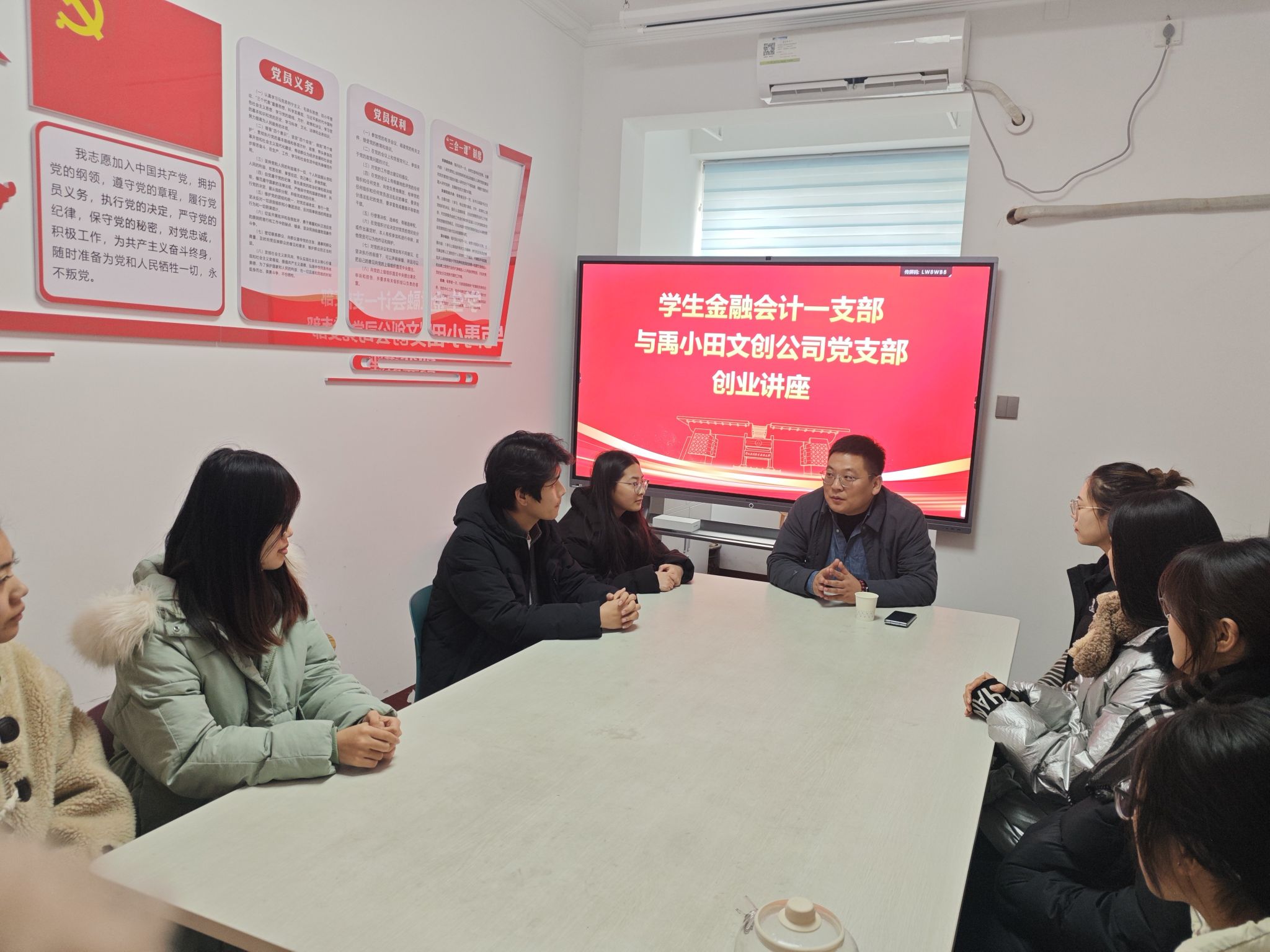为进一步激发学生创业热情,拓宽创业视野,凝聚校企共建育人合力,12月30日中午,学生金融会计一支部特邀支部共建单位禹小田文创公司党支部书记田坤在守诚学生工作驿站为支部学生党员开展专题创业讲座。