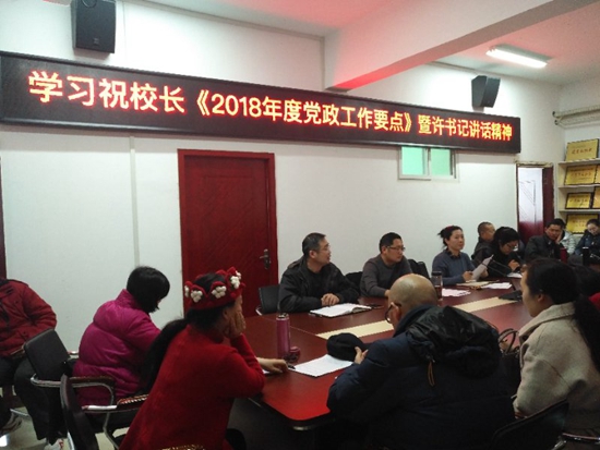 会议主要内容是学习祝校长《2018年度党政工作要点》暨许书记讲话精神。
