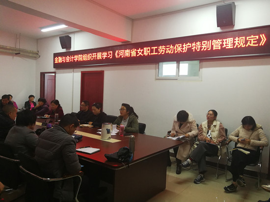 为提升女教职工自我保护意识和法律维权意识,推动女教职工权益保护法律法规和政策的贯彻落实,营造尊重女性社会价值、关心重视女教职工劳动保护的良好氛围,11月6日下午,金融与会计学院在SY5412会议室召开全体教职工会议,组织大家学习《河南省女职工劳动保护特别规定》。