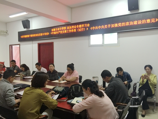 定期组织党内政治学习生活,不断增强党员的政治理论修养,是我们党的优良传统和政治智慧。2019年4月16日,金融与会计学院在SY5412会议室组织全体教工党员召开政治理论专题学习会,集中学习《关于新形势下党内政治生活若干准则》《中国共产党支部工作条例(试行)》《中共中央关于加强党的政治建设的意见》。会议由院党总支书记殷莺主持。