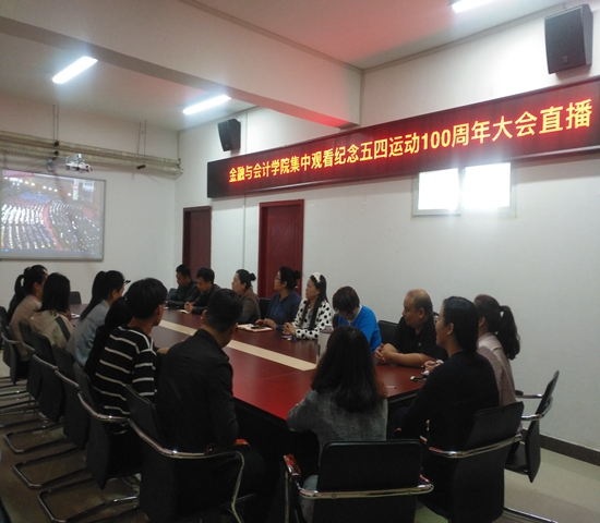 2019年4月30日上午10:30,金融与会计学院党总支、分团委组织党员干部、青年教师代表、学生党员代表、学生团干部代表在SY5412会议室收看纪念五四运动100周年大会的直播。院党总支书记殷莺主持本次活动。