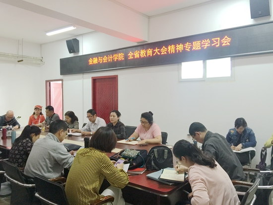 5月14日下午3点,金融与会计学院在SY5412会议室召开全省教育大会精神专题学习会。学院全体教职工参加了此次专题学习,会议由院党总支书记殷莺主持。