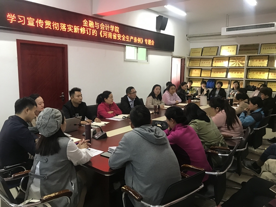 10月15日下午,金融与会计学院在SY5412召开《河南省安全生产条例》专题学习会。全体教职工参加。会议由院长宋建涛主持。
