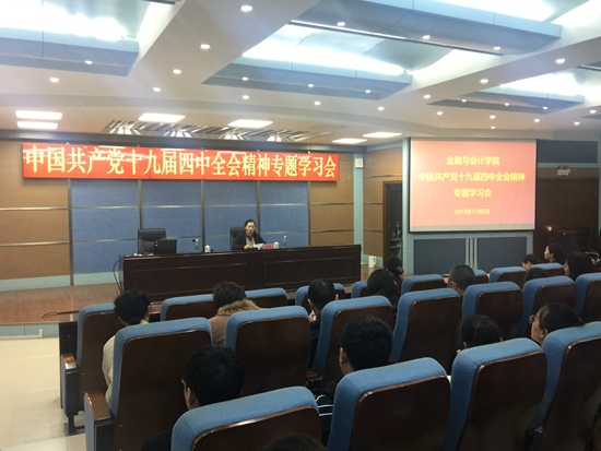 11月5日下午,金融与会计学院在3号实训楼学术报告厅召开中国共产党十九届四中全会精神专题学习会,全院教职工、学生党员、入党积极分子参加。会议由党总支书记殷莺主持。