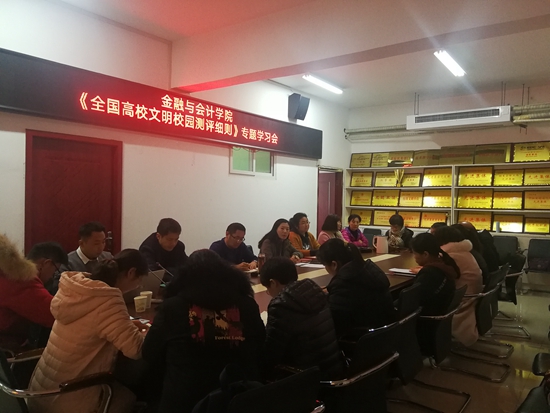 11月26日下午,金融与会计学院在SY5412会议室召开《全国高校文明校园测评细则》专题学习会,全体教职工参加。学习会由院长宋建涛主持。