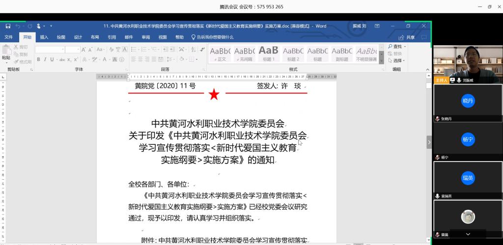 331日上午,金融与会计学院院长宋建涛主持召开科级以上干部视频会议,下午各教研室、各科室分别召开视频会议,组织全体教职工学习《中共黄河水利职业技术学院委员会学习宣传贯彻落实<新时代爱国主义教育实施纲要>实施方案》及《关于开展把疫情当教材 与祖国共成长主题教育活动的通知》精神。