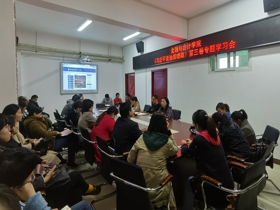 10月6日下午,金融与会计学院在SY5412会议室召开政治理论专题学习会,会议深入学习了《习近平谈治国理政》第三卷第二专题《不断增强“四个意识”、坚定“四个自信”、做到“两个维护”》,全体党员干部、教职工参加。学习会由院长宋建涛主持。