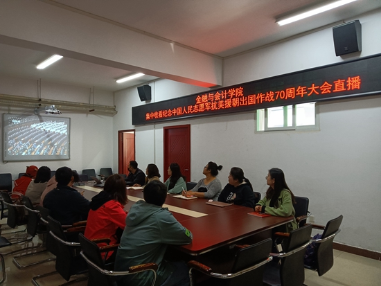 10月23日上午,金融与会计学院召开在SY5412会议室专题学习活动,集中观看纪念中国人民志愿军抗美援朝出国作战70周年大会直播,院领导班子成员、党员干部参加。