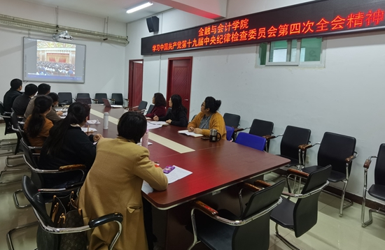 1117日上午,金融与会计学院在SY5412会议室召开中国共产党第十九届中纪委四次全会精神专题学习会,全体科级以上党员干部参加。会议由党总支书记殷莺主持。