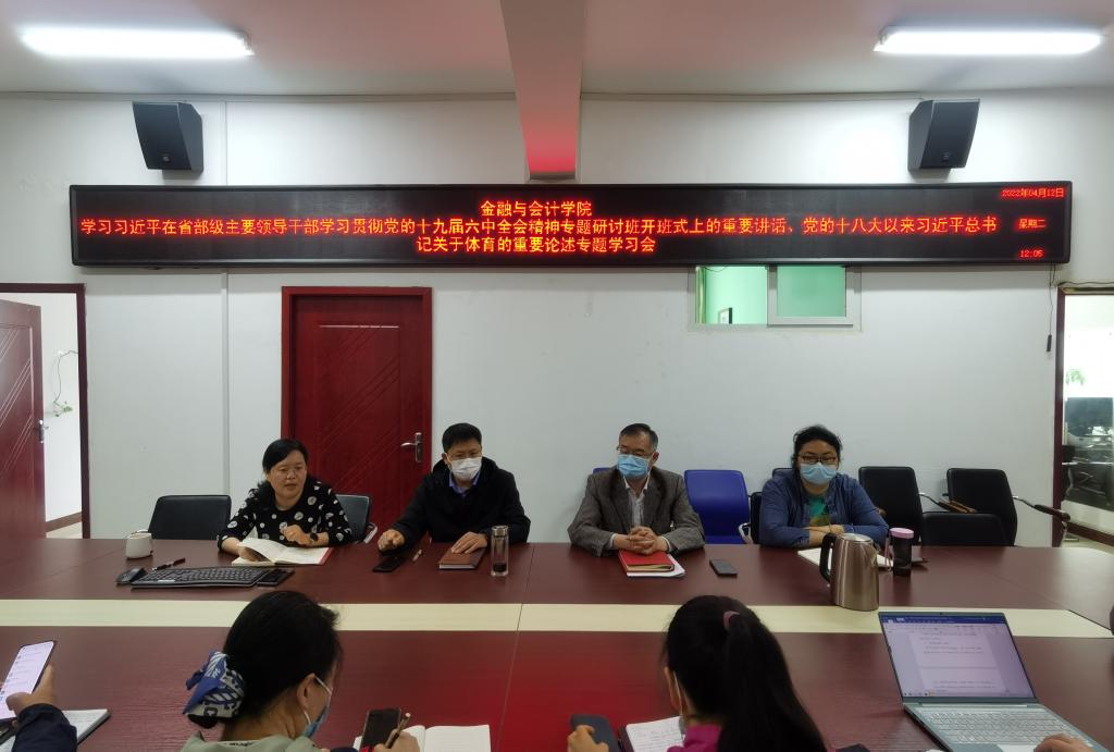 412日上午,金融与会计学院在SY5412会议室召开专题学习会,集中学习习近平在省部级主要领导干部学习贯彻党的十九届六中全会精神专题研讨班开班式上的重要讲话、党的十八大以来习近平总书记关于体育的重要论述,全体科级以上干部参加。会议由院长李冠军主持。