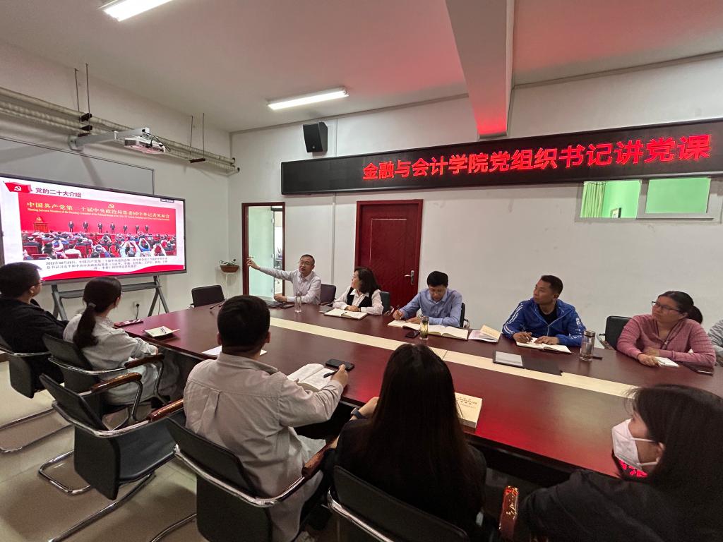 5月12日下午,金融与会计学院党总支书记吴宗奎在SY5412会议室以《学习二十大 奋进新征程》为主题,为我院党员、干部上专题党课。