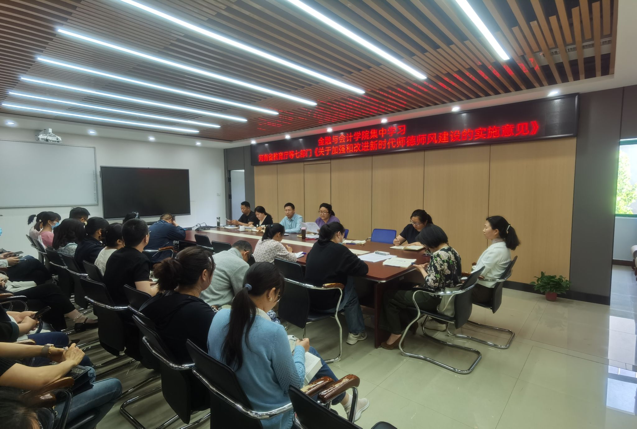 4月23日,金融与会计学院在SY5412会议室召开师德师风专题学习会,全体教职工参加会议,会议由党总支书记胡晓慧领学。