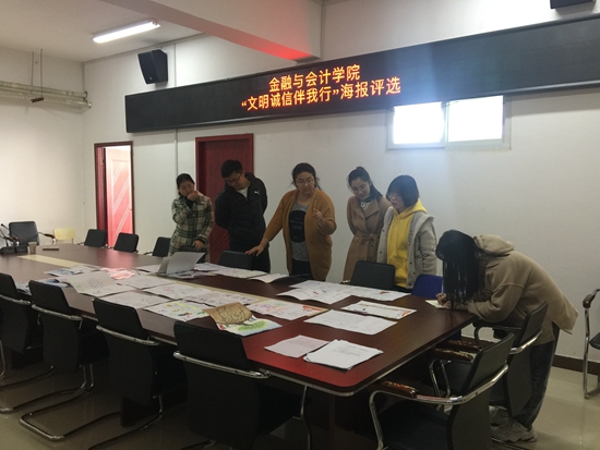 为增强学生的诚信意识,我院于11月15日在SY5412会议室举办“文明诚信伴我行”海报评选活动。党总支副书记胡晓慧、分团委书记马峥、辅导员闫艳、杨士卿、魏晓慧、方芳担任此次活动的评委。