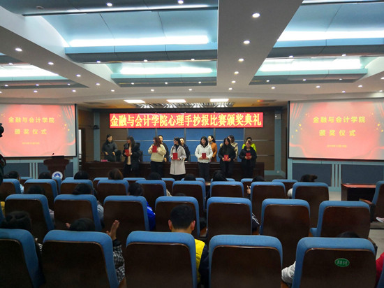 1218日下午,金融与会计学院在三号楼学术报告厅举行“不忘初心,成就自我”心理健康手抄报大赛颁奖仪式。院党总支书记殷莺、副书记胡晓慧、分团委书记郝瑶,各年级辅导员以及1718级学生代表200余人参加了颁奖仪式。